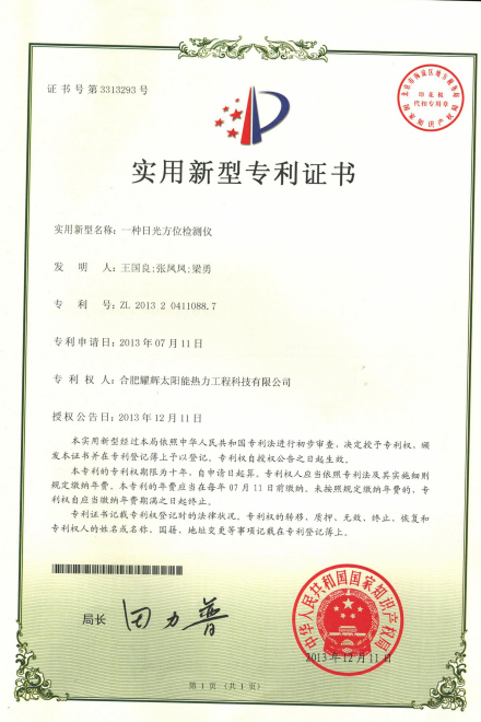 實(shí)用型專利 - 合肥耀輝太陽(yáng)能熱力工程科技有限公司